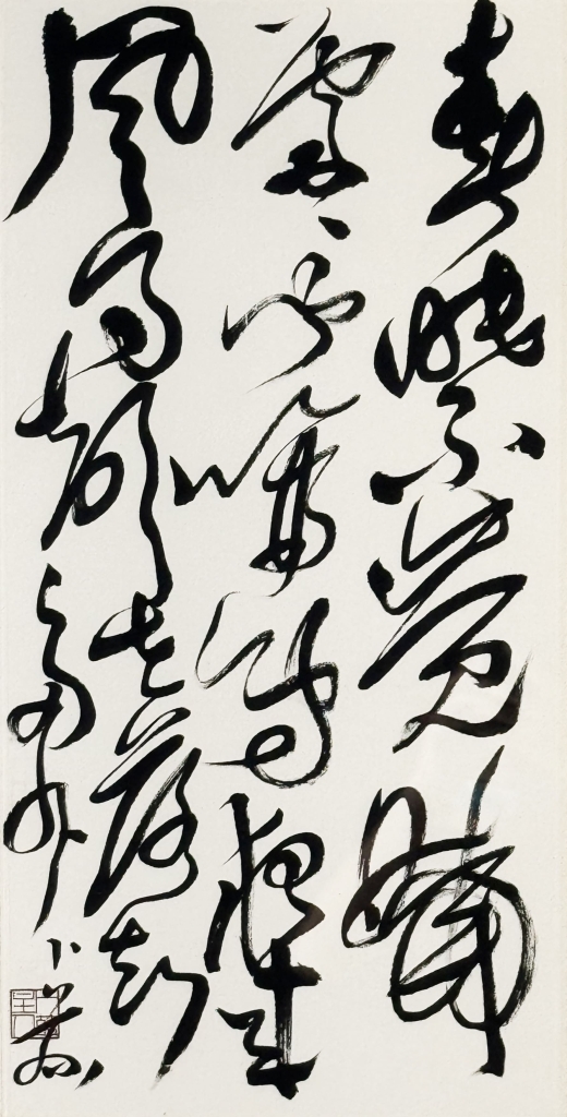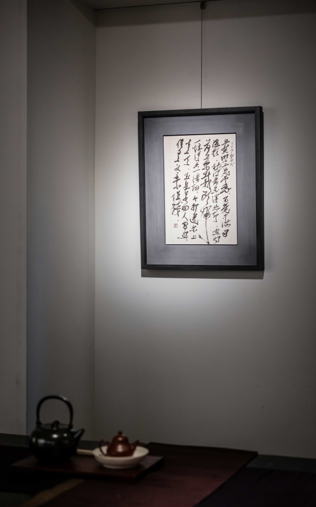 卜茲之書自由變化,不以其形,以意為之,成就獨有的藝術風格。書寫內容摘句皆扣合其心緒思想,此乃蔡邕所言:「書者,散也。欲書,先散懷抱,任情恣性,然後書之」。而,展覽中最後一件書作2012年〈片雲飛〉,「文長曾寫此詩。忽然湖上片雲飛,不覺中流雨濕衣。折得荷花渾忘卻,空將荷葉戴頭歸。一炷清香一縷烟,今朝送爾上青天。玉皇若問人間事,惟有文章不值錢。」此時卜茲的書法已自然鎔鑄晚明草書諸家,筆法靈動自在,縱橫有勢。而徐渭之詩,再次躍然紙上。