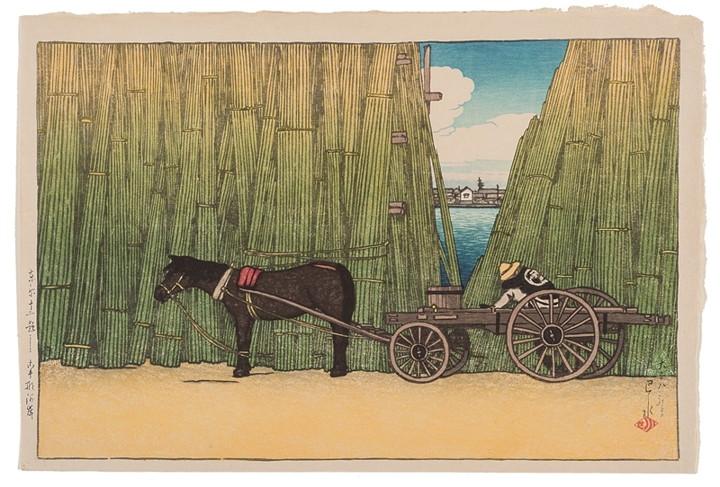 川瀨巴水是最為多產、多變、且遊歷見聞豐富、最為西方觀眾所熟知的新版畫藝術家之一。此幅版畫來自「東京十二題」系列,為本展中紀年最早的作品,其沿襲了浮世繪傳統,然而不僅是透過藝術創作忠實記錄所見之景。在溼熱的東京夏日,一位疲勞的捆竹工人正在馬車上午睡。一綑綑的竹子像是舞台背景垂幕般阻擋了河川的水平視野,使焦點集中於休息中的工人和他的馬車。然而,竹子間的V形開口使觀者能夠一窺隅田川及對岸景色,並似乎在微風中感受到了一股涼意。擅於融入西洋繪畫技巧的巴水,為觀者呈現了一幕東京的永恆片刻。
