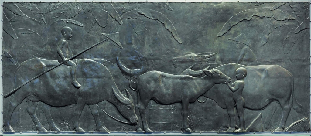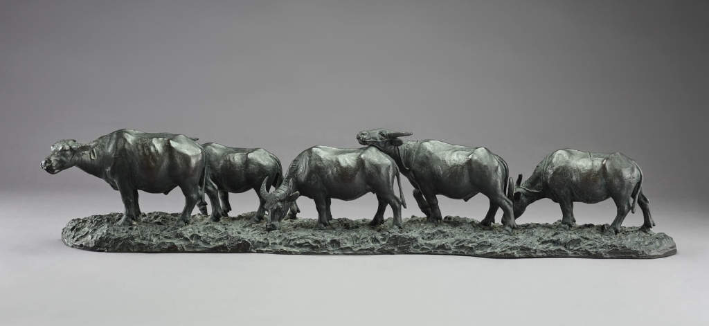 一想到黃土水,多數人會想到他的經典代表作「水牛群像」。黃土水在東京求學時體悟出藝術的價值,在於實現自我特色,因此台灣水牛成為他重點研究的對象。他不僅到屠宰場借用牛頭、四肢、腳蹄翻印石膏模,1923年回台時還飼養水牛,一起生活數月觀察其骨骼結構、習性及動態。隔年,1924年成功以水牛題材〈郊外(水牛與白鷺鷥)〉入選帝展,作品以三隻鷺鷥與水牛,共譜台灣田園悠閒的曲調。