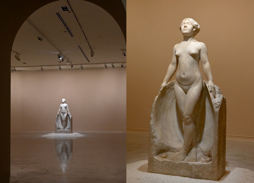1921 年黃土水第二次入選日本 「 帝展 」 的代表巨作〈甘露水〉,從1919年開始創作,所使用的石材並非純白色大理石,而是帶有紋路的淡黃色石材,屬於當時較為便宜的建材,是學生時期黃土水能負擔的材料,但比起純白大理石,材質不均更難駕馭。〈甘露水〉不但是日本雕刻界少見以女性裸體為主題的作品,等身高的東方女性雕塑出女子閉眼,自信迎向雨露潤澤的形象,彷彿東方「維納斯」,也是台灣第一件女性裸體雕刻創作。