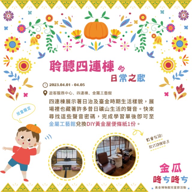 黃金博物物館以金瓜石的聲音為主題,特別規劃「金瓜咚ㄘ咚ㄘ」兒童節系列活動,邀請大小朋友一起來玩!