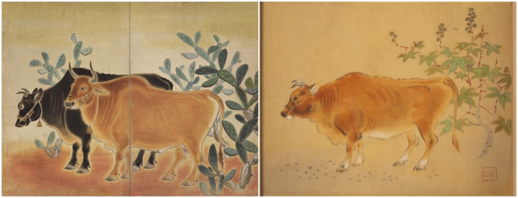 此次進行修護的〈黃牛〉,是畫家在日治時期參加府展前的試作小品,成就了1941年林玉山推薦(免審查)出品第4回府展東洋畫部的畫作〈雙牛圖〉。日治時期,台灣「水牛」被視為最具地方特色的景物,林玉山從第一回台展起,便長年鑽研牛的主題,透過寫生觀察的方式,畫出栩栩動人的生命力,並據此表現台灣鄉間敦厚純樸的風土。這幅〈雙牛圖〉以平面化、圖案化的手法處理牛隻與仙人掌,表現裝飾性趣味。本次修護之〈黃牛〉構圖〈雙牛圖〉相似,但筆觸線條更為鮮活生動,以台灣蓖麻作為背景,同樣保有地方特色元素。不知為什麼畫家最後決定以仙人掌取代蓖麻為背景,讓〈雙牛圖〉增添了一股異國風情。兩相比較下,也可看見藝術家創作過程中的變化取捨,十分有趣。