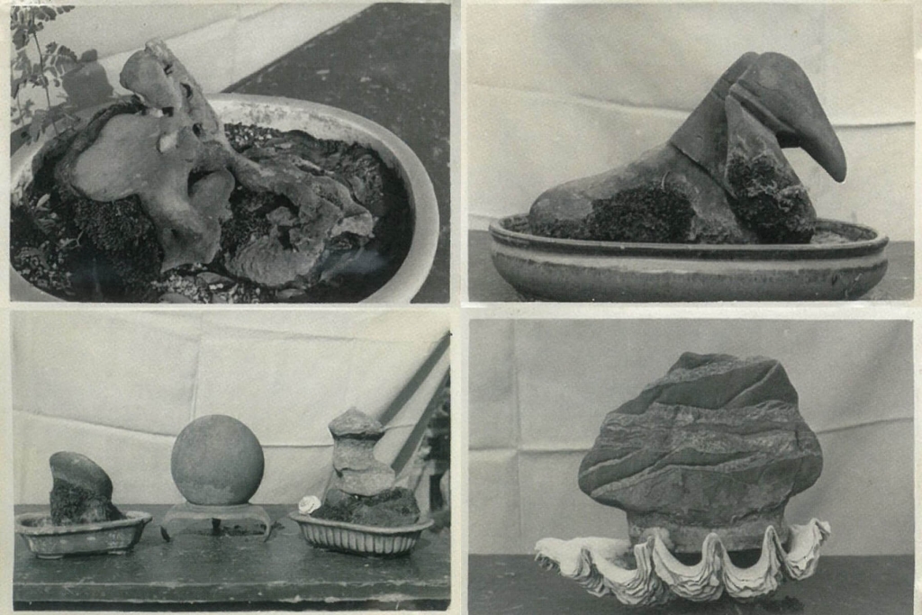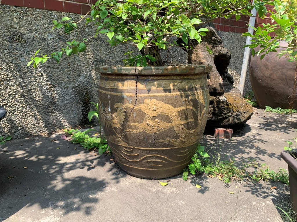 曾在文獻上讀到,張李德和1962年因協助週轉,被迫出售故居,而自己收藏的奇石寄付在嘉義紅卍字會。此時的我,才突然意識到,這似廟非廟的建築正是嘉義紅卍字會。在百年後的今日與琳琅山閣相遇,與李德和的花園相遇,哪怕凋零與荒廢,都保留了僅有的歲月靜好。在盆景、奇石、造景等僅存的物件裡,最讓我感到悸動的莫過於與陳澄波畫作〈琳琅山閣〉中形狀相當的碾布石,以及〈庭前所見〉畫作中,器型樣式相仿的龍紋蓮花缸。這是閱讀李德和與「真跡」會晤後「有的無的」小默契與小狂喜。