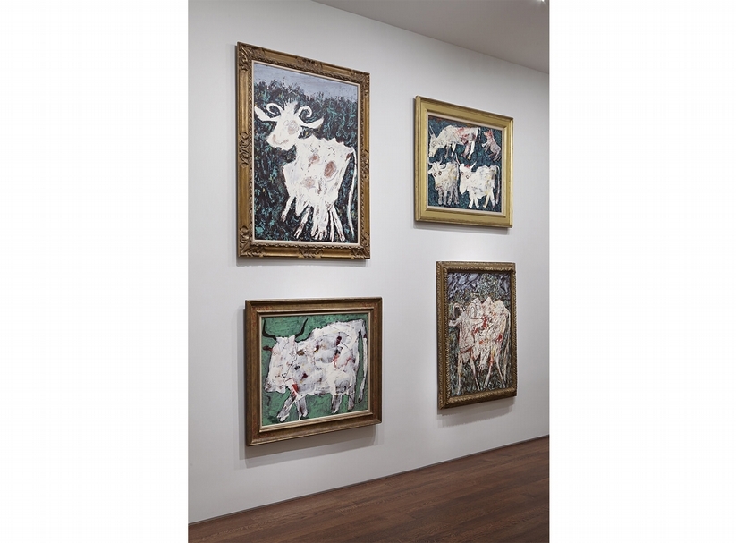 圖中作品由左至右,上至下:Vache la belle tétonnée (Cow with the Beautiful Udders), November 1954, Judy and Michael Steinhardt Collection, New York Vaches au pré (Cows in a Meadow), August 1954, Private Collection, courtesy Richard Gray Gallery Vache aux cornes noires (Cow with Black Horns), August 1954, Private Collection Vache la belle muflée (Cow with the Beautiful Muzzle), November 1954, Janklow Collection, New York