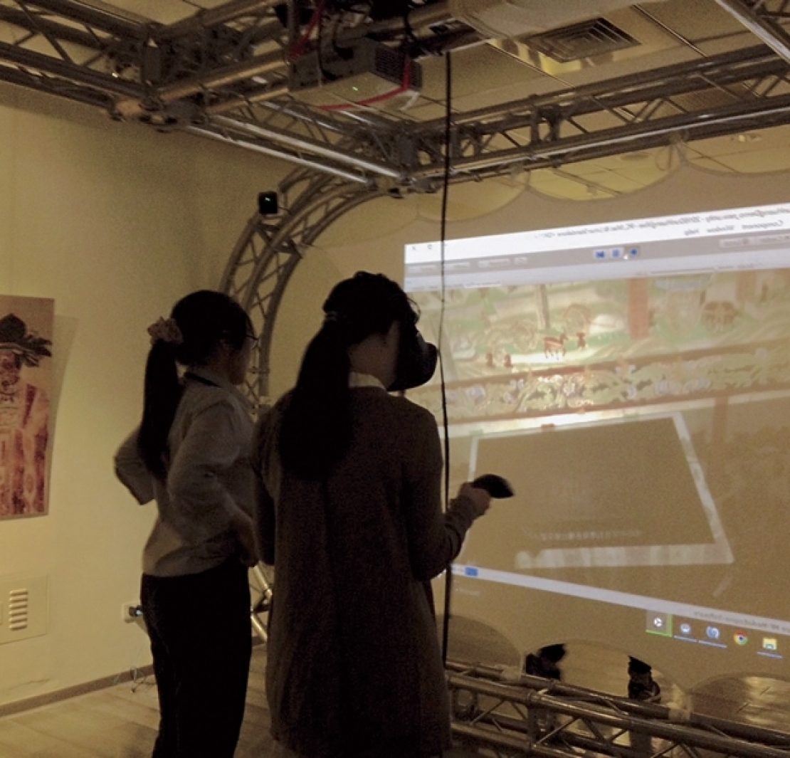 小時候是否曾幻想,如同冒險電影的男女主角一般拿著大探照燈,在黑暗的神祕洞窟中穿梭,尋找遺落在荒煙漫草間的歷史寶藏?有無好奇過中國山水畫的世界是什麼光景?隨著虛擬實境技術(virtual reality,簡稱VR)的進步,如今透過一台頭戴式顯示器,人們就可進入被稱作世界文化遺產的莫高窟,以及前往趙孟頫筆下〈鵲華秋色〉的世界。國立台灣大學博理藝廊於11月14日開始展出兩套全球首發的歷史文物虛擬實境體驗系統,為期兩週的體驗活動,成功吸引歷史愛好者的目光。