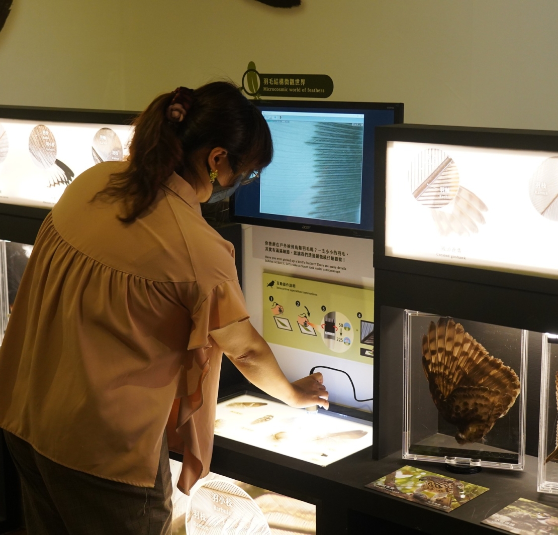 設有多體驗互動展區,透過顯微鏡互動裝置認識鳥類羽毛結構 (圖/台博館粉絲專頁)