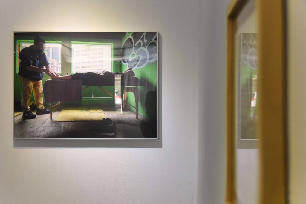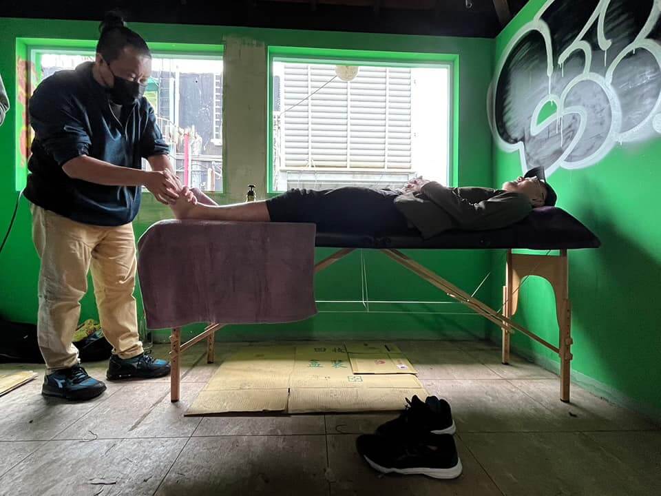 《喵喵凳》是位於展場一樓的第三件作品,一件影像輸出與文件裝置。影像拍攝的內容,是西門町的「腳底按摩」場景。西門町內的「獅子林商業大廈」,舊址為「東本願寺」,過去曾被「台灣省保安司令部」用來審訊、關押政治犯,並據聞曾使用「老虎凳」此一對膝關節施壓的刑具。「獅子林商業大廈」在70年代於西門町原址落建,過去使用「老虎凳」施行國家暴力的場域,其周邊在今日成為藉由「腳底按摩」營利的商業空間。今昔對比,在同一場址及其周邊場域,出現了兩種對「雙足」「施加壓力」的方式。值得注意的是,「老虎凳」是對「關節」進行壓迫的技術;「腳底按摩」創始者吳若石神父(Josef Eugster Johann,1940–),之所以開始研究並發展「腳底反射療法」,最初目的則是為了治療自己的「關節炎」。膝關節屬於活動關節中的「鉸鏈關節」(hinge joint),骨塊之間只限上下、無法左右運動。「老虎凳」為中國獨有的刑求技術,利用膝關節的鎖扣機制,反向進行施壓;「腳底按摩」為瑞士籍神父派赴台灣時研發,利用將身體形象反射在腳底的「區域反射理論」,透過對腳底進行施壓,緩解全身的疼痛。翔宇透過今昔對比,不只揭示出兩種對足部施壓的技術,也揭示了兩種技術在台灣出現的歷史背景,及其難以迴避的政治意識型態聯想。