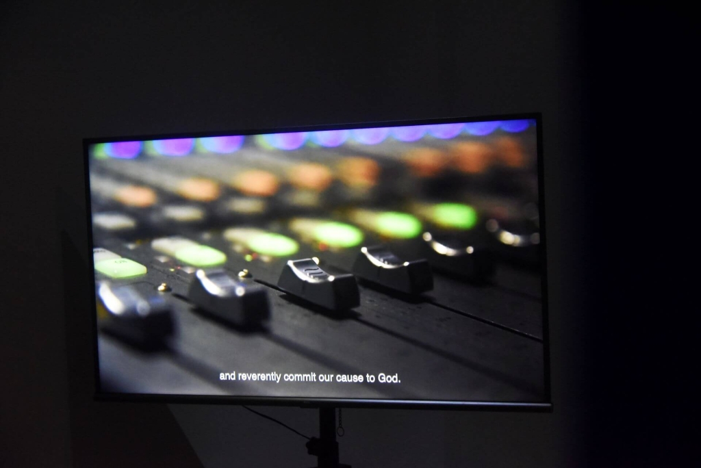 《王者之聲》是位於展場地下室的第一件作品,是一件錄像裝置,作品名稱來自一部攝於2010年,根據英國史實改編而成的同名電影,劇情講述自幼患有嚴重口吃的英王喬治六世(George VI,1895-1952),如何在澳籍語言治療師萊諾.羅格(Lionel Logue,1880-1953)的協助下,於二戰爆發後二天,透過廣播向英國民發表對德國宣戰的著名演說,並鼓舞全國軍民的故事。翔宇的錄像作品使用了電影中英王喬治六世透過廣播進行演說的聲音,卻為這段聲音配上一段重新錄製的影像。拍攝內容除去所有人類影像,而是透過廣播間內所有器材的依序運作,以及攝影鏡頭在廣播間內的遊走與剪接,形成帶有某種擬人化的娛樂風格,卻又同時讓人感受到莊嚴肅穆的場面調度。英王的聲音飄蕩在空無一人的廣播間內,獨特的音色與演說的內容,彷彿不再是(人類)主體的表達,而是一齣供廣播間內的各種媒介物排練演出的劇本或舞碼。若就展覽動線而言,《王者之聲》位於《喵喵凳》之後,更讓人想起二戰結束前,對台灣人而言的另一位「王者之聲」,即被稱作「玉音放送」的昭和天皇終戰詔書廣播。