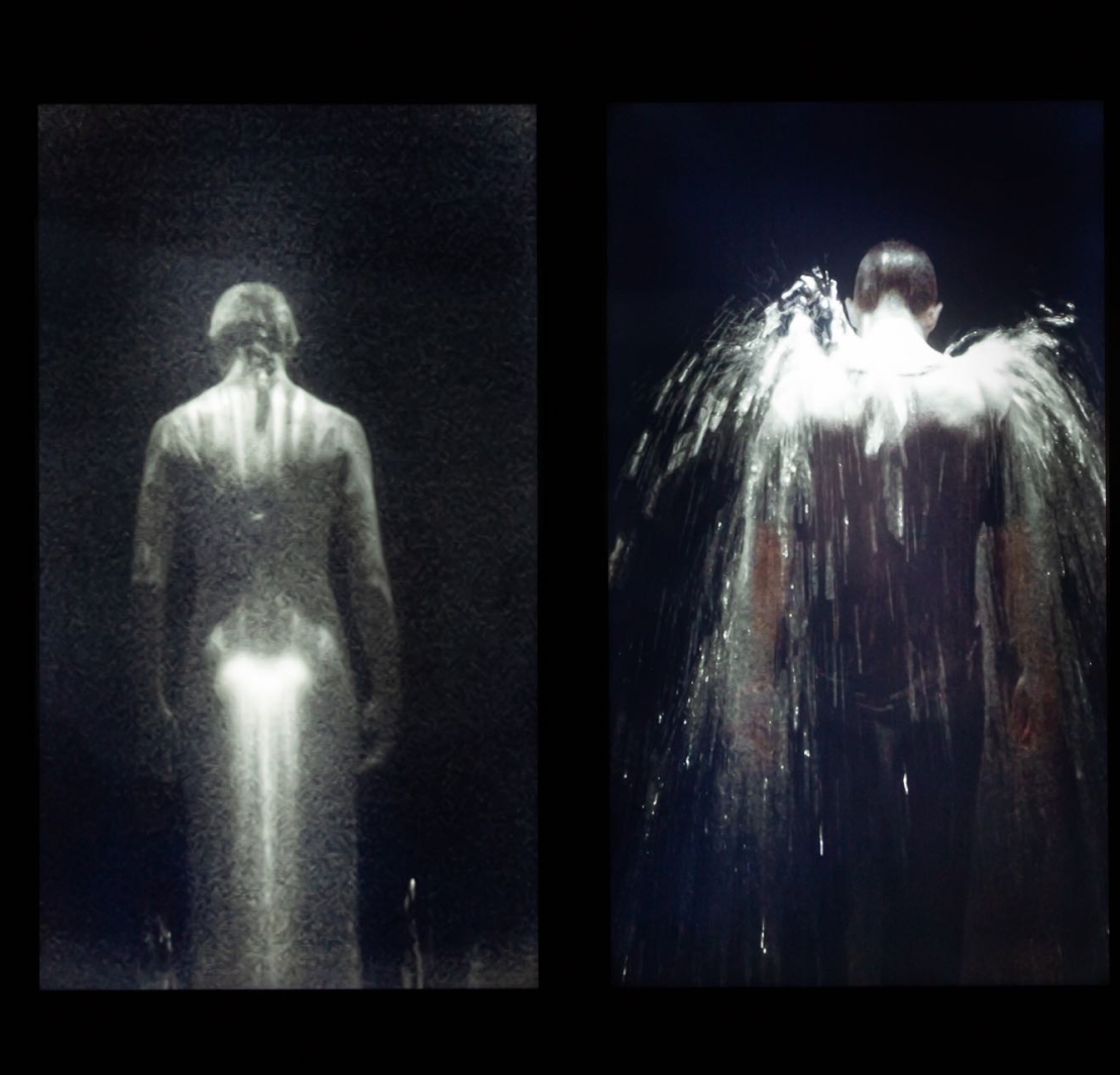 在引路人的指引與月亮的見證下,我們渡過了河流,來到了死亡的第二階段:消融。消融時間、空間、身體,與意識。吳季璁《寫生習作 001-龍洞海景》(2021)藉由即時影像演算處理系統,在錄製浪起浪落的當下將影格層層疊加,創造出界於靜態與動態間、消逝與永恆間的獨特時間感。王雅慧在《問影》(2017)裡先以水墨構築線條,再將作品對折、拍照攝影,製作出似真又假的光影及空間感。從二維、三維,再回到二維,藝術家運用多重技法,挑戰我們既有感官所認知的空間結構。採用水元素的比爾‧維歐拉(Bill Viola)的《無辜者》(2007)與李雅諾的《水》(2007),在這次的展覽脈絡裡或許可以視為身體的銷解:水不僅象徵連結不同維度之間的界面,在神秘學中也常有洗滌、純化、潔淨之意。