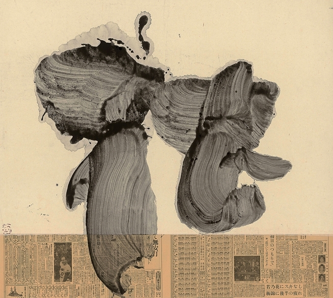 井上有一《花》.凍墨、日本紙、新聞紙.73.5×82.3 cm.1960。(百藝畫廊提供)