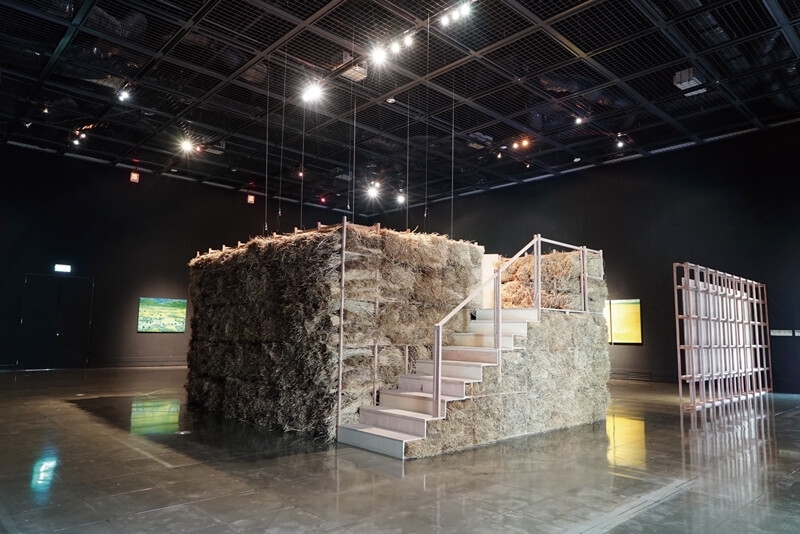 位於台東美術館展場中以稻桿搭建的亭台。圖|林煜幃攝影、台灣好基金會提供