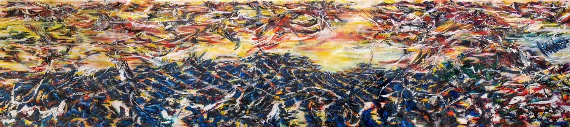 王淑鈴把自身與大甲溪相處的時間與空間情境融入畫面當中,並將中國山水畫的抽象概念提煉至當代語言,透過書法般的筆勢線條交織出繁複的結構,在層層堆疊的線條中相互呼應、牽引,反映出她對大河的所感所察。畫布上筆觸的縱橫交錯、布局的張弛緩急,如同河水推進的起伏節奏,過程中有湍急的激流亦有平緩的靜流,皆任憑她在其中快意揮灑,激盪起的水波或強或弱地撩撥人心。