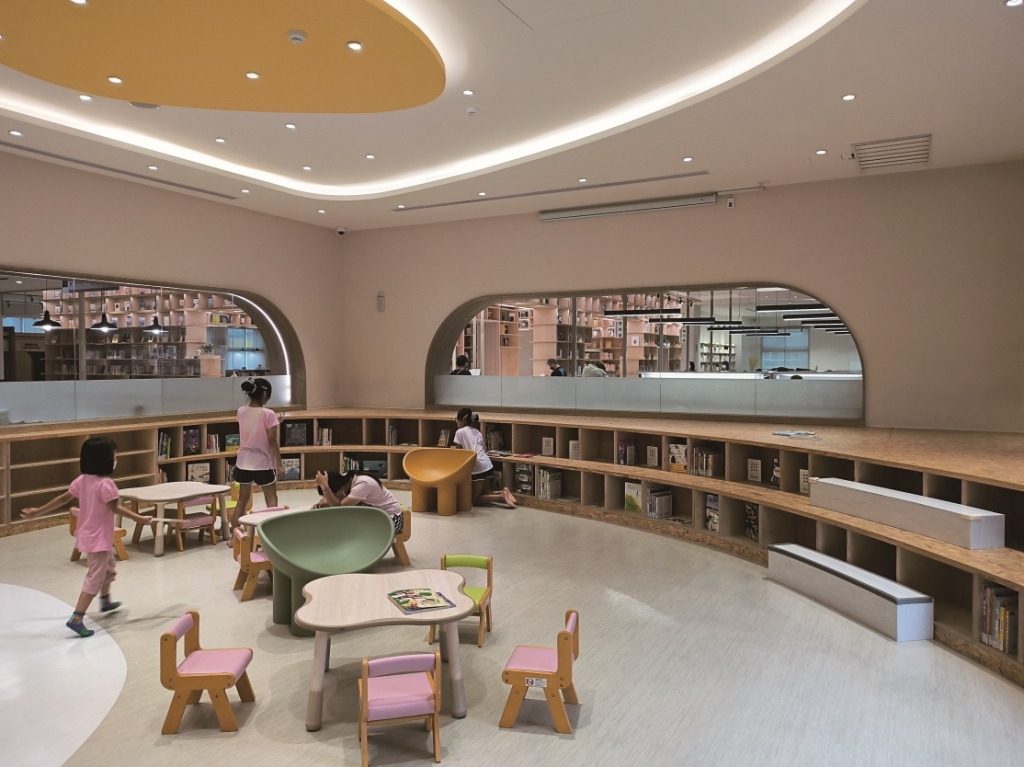 特別值得一提的是近50坪的兒童閱讀空間,這個專屬於兒童的區域擁有階梯書架舞臺、大面開窗和STEAM磁貼牆,創造出充滿童趣和創意的氛圍,讓孩子們在閱讀的同時能夠發揮創造力。