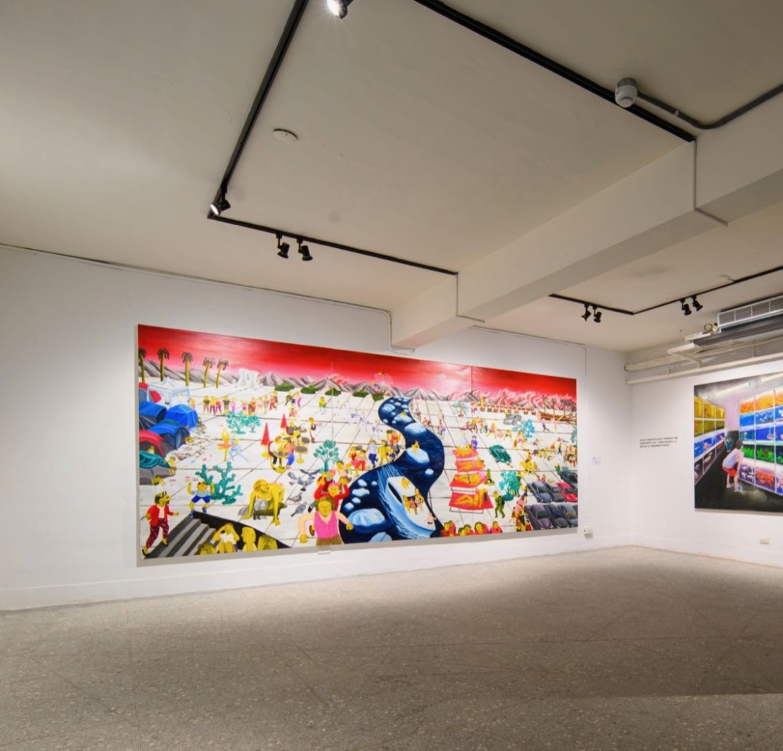 最後,胡永芬特別提到劉耀中2022年《都市風景》,這幅畫描繪都市中遠景 ,上空有架飛機飛過去,後面拉著一條小飄帶,寫著What would Tyler Durden do?(泰勒‧杜登會做什麼?)。Tyler Durden是大衛.芬奇(David Fincher)電影《鬥陣俱樂部》(Fight Club,1999)裡面布萊德.彼特所飾演的主角名字,在電影中主角與幻想的自己不停搏鬥。胡永芬認為那個角色代表著狂野的自己、自由的自己、什麼都敢冒險實驗的自己,剛好跟這次藝術銀行「上半場比數 10:10」的主題做了一個有趣的呼應,藝術家是不停與自己對戰的。同時這句話也被網路上一個八卦博客借鑒,結合基督教的勵志短語「耶穌基督會做什麼?」來給自己命名,進行發布假消息、假圖片的行為。在名作與劣跡博客之間輕巧翻轉,正是劉耀中最擅長的幽默身段。