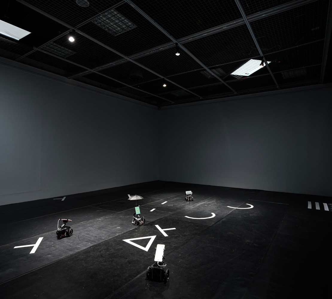 就此而言,洪梓倪《極度擴展》的光動力裝置,是需要透過社群媒體,進一步結合聽覺濾鏡與AR與觀者互動,才能有完整的作品觀看經驗,深刻體現由手機形成的當代人類連結狀態。貳進《Data-Verse Taipei 02》的數據視覺化,以及林政佑在《WoWtchout》中,透過裝載螢幕的動態小機體、行車影像傳播文化與身體的移動關係等,建構一套熟悉且趣味的觀看、影像與積聚的迴路裝置。