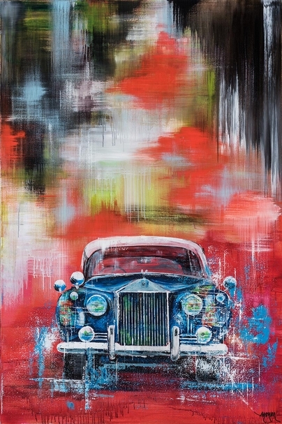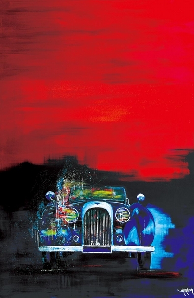 像馬克.羅斯科(Mark Rothko)畫作般的大片火紅色域,宛如燃燒豔紅的夕照。一部寶藍色的勞斯萊斯迎面而來,車燈與輪胎上噴發出不尋常的火焰。置中對稱的大膽構圖,將強烈色彩對比迸發出的視覺刺激協調為一種老時代的優雅,有評論者說,那畫面讓他想到來自黃金年代的翩翩紳士,在一日酒酣耳熱後驅車而歸。