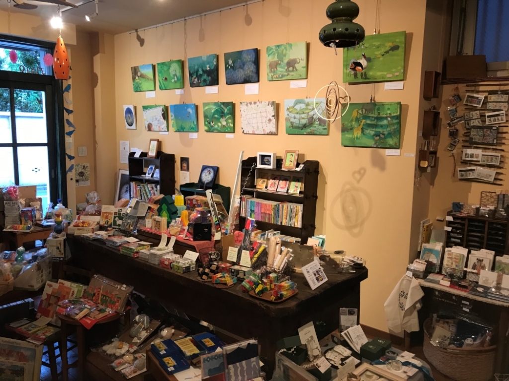 一進門中央的大桌子上擺滿了琳瑯滿目的木頭玩具,主要都是從德國進口。右邊則有兩個大書架,左邊也有小桌子陳列雜貨,牆上一小區是展示原畫的空間。當時展出的是丸山綾子的《蒲公英之船》(たんぽぽのふね)。店長曾經在幼兒教育出版物及玩具的公司任職,在這個書店內收集了她自己喜歡的東西,希望打造一個不管大人小孩都能「自得其樂」的空間。