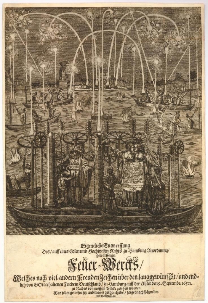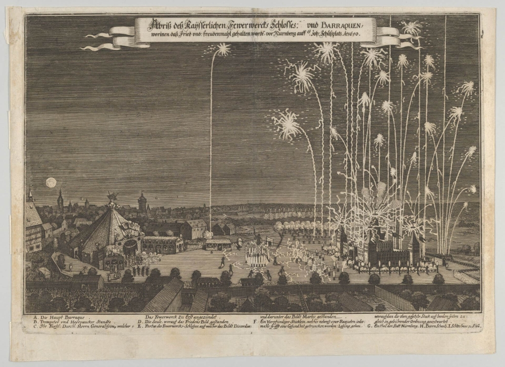 14世紀中國火藥傳入歐洲,並於16世紀中期德國紐倫堡發展出基礎的煙火技術,夜間施放煙火成為當地長達數日傳統狂歡節慶(Schembart Carnival)的高潮。(註1)16世紀歐洲人成功將煙火施放到了空中,以慶祝軍事勝利、宗教活動或皇室慶典等活動。這些重要的公眾活動在17至18世紀,經常被描述記錄在由官方出版的「節慶書」中,如宗教節慶、國事訪問、貴族婚禮、軍事勝利、加冕典禮和皇室生日等,並透過版畫留下了許多慶典或紀念時刻施放煙火的盛況。