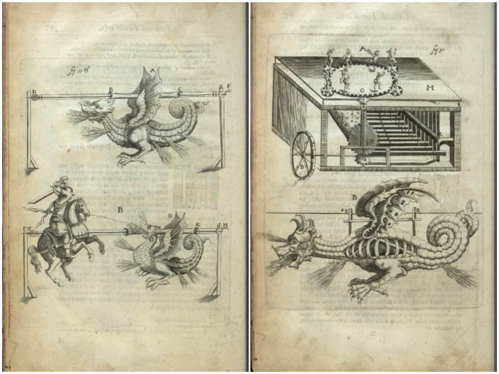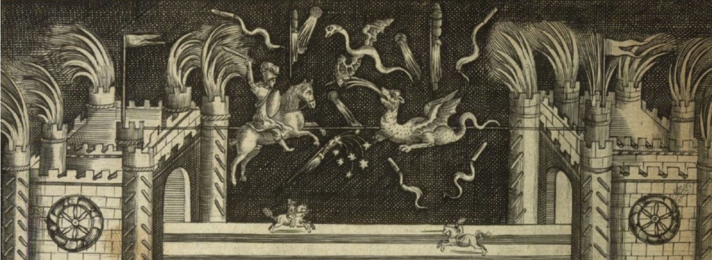 實際上,早期歐洲的煙火表演比起現代高空煙火秀,更像是一場驚心動魄的舞台演出。表演通常以寓言敘事的方式呈現,或者布置象徵性故事的場景。在當時的煙火論著描述煙火表演時,認為舉辦煙火表演就如同舉辦一場戰役一樣。而演出的敘事內容往往以善與惡之間的碰撞與衝突為基本形式,並以力量強大且善良的一方獲得勝利。1635年約翰.巴賓頓 (John Babington)的著作《人造煙火論》(Pyrotechnia),是英國第一本專門論述煙火的書籍。書中介紹如何製作不同類型的煙火,以及如何使用車輪、水球等設備以最佳方式展示煙火。清楚揭露了煙火藝術的基礎,各種裝置如何在火的幫助下進行直線和圓形運動。這些裝置甚至包括了騎馬的聖喬治與噴火惡龍在兩座城堡間激戰的場景,顯示早期歐洲煙火表演的戲劇特質。(註5)