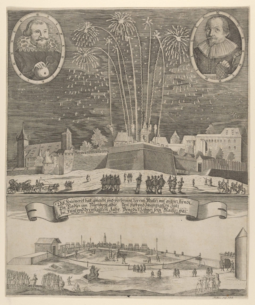 註1 Schembart,源自民間習俗和齋戒前的狂歡,節慶在1449年至1539年之間在紐倫堡至少舉行了64次。之後由於太過喧鬧,被市議會禁止。Suzanne Boorsch, “Fireworks! Four Centuries of Pyrotechnics in Prints & Drawings”, The Metropolitan Museum of Art Bulletin, v. 58, no. 1 (Summer, 2000), p. 8.