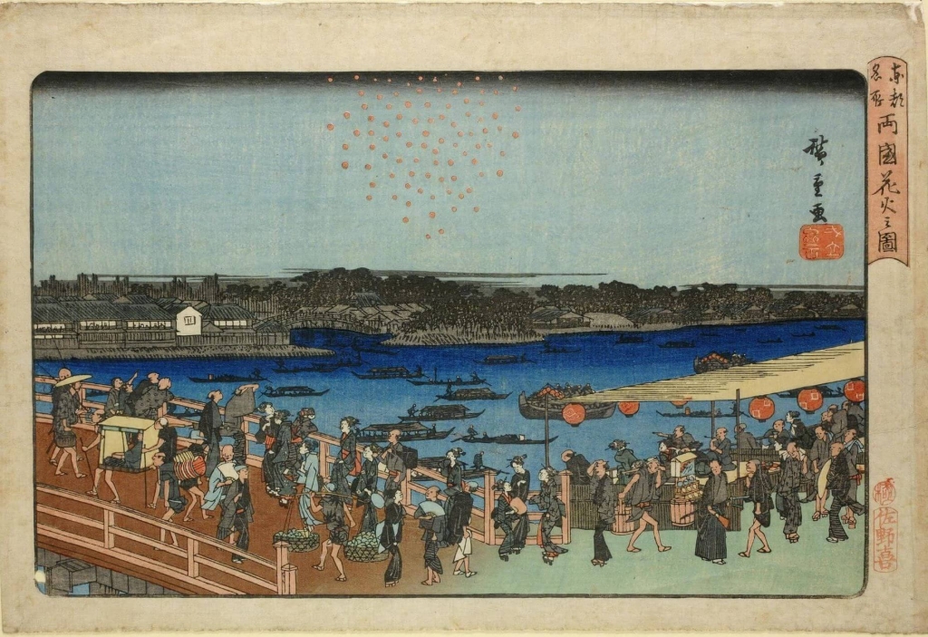 浮世繪大師歌川廣重曾形容兩國橋為「東都最熱鬧的地方,有雜耍、有劇場、有說書、有夏日煙火,晝夜不停,娛樂不絕」。河上也有各種貨船和客船,河邊邊一整排的茶攤,人們可以在那裡放鬆身心,欣賞煙火,就像現代的河畔咖啡館一樣。歌川廣重在描繪兩國花火主題時,畫面多帶有一種適度的熱鬧,不擁擠也不吵雜,完美的傳達夏夜微涼的天氣與節慶歡樂的放鬆氛圍。