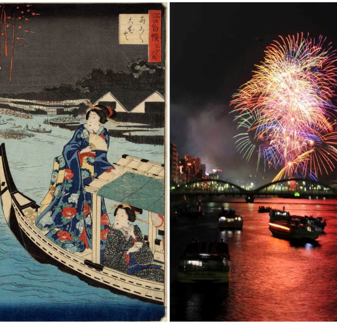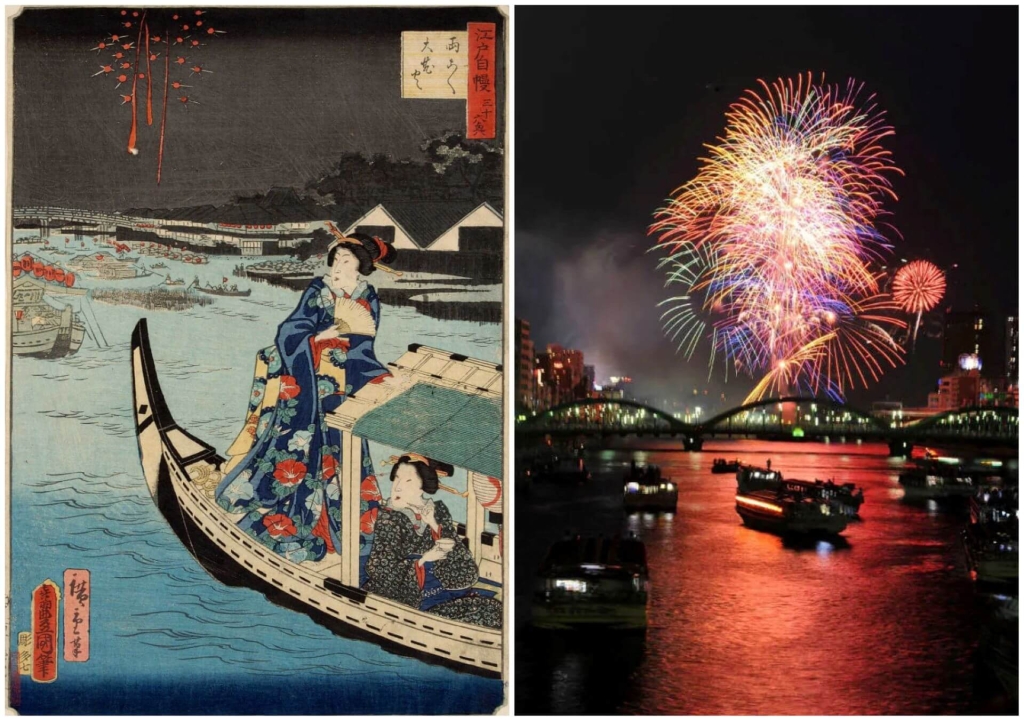 日本歷史最悠久的隅田川花火大會,是一年一度的夏季盛事,起源自1733年的一場祭祀煙火儀式。當時霍亂在江戶城(東京)肆虐,奪走了大約90萬條生命。為了祈求疫情平息,德川吉宗將軍 (1684–1751) 下令在兩國川上施放20發煙火作為開河祭(川引)儀式,以驅散當時席捲日本的瘟疫和飢荒的邪靈,並悼念因疾病而喪生的人們。