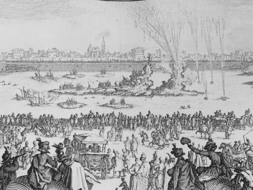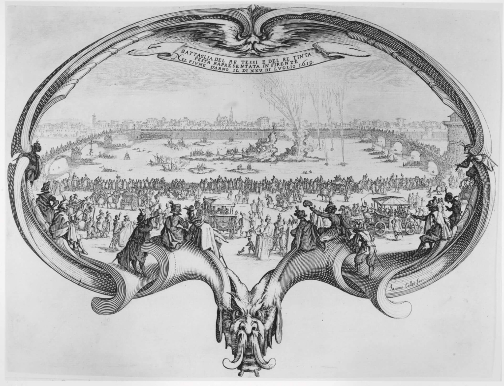 卡洛(Jacques Callot, 1592–1635)的扇形銅版畫,也記錄了一場1619年佛羅倫薩的聖雅各伯慶典。此次演出由染匠和絲織工公會,各派出50位公會成員舉辦了一場模擬戰爭。戰爭場地位在阿爾諾河上的小島上,過程中染匠佔據了巨大岩石,將織布者扔進河裡,並偷走了為火神赫淮斯托斯準備的祭品,奉獻給女王。最終,火神生氣地引起了一場煙火表演,照亮了河岸,在震撼的煙火聲中結束了節慶。煙火製造出來的巨大火光,精彩地為整個戲劇演出增添衝擊性的視覺效果。