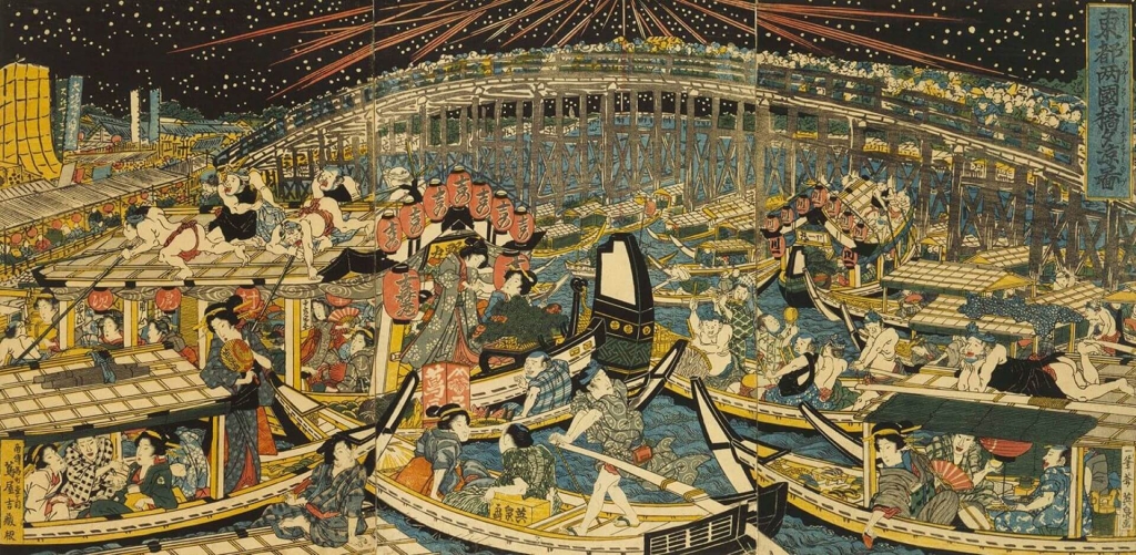 每到夏季煙火大會時,人們蜂擁而至,導致交通堵塞。兩國橋上人流如織,每次煙火燃放時,人們都會高喊「玉屋ぁ(Tamayaaa)~」和「鍵屋ぁ(Kagiyaaaa)~」兩大煙火商的名字。(註9)盛大的兩國煙火秀,也成為浮世繪風俗版畫中的重要主題──「兩國花火」。這些版畫通常以各種角度描繪在兩國橋上綻放的夏季花火,展現壯觀的煙火表演和繁華的節慶場面。