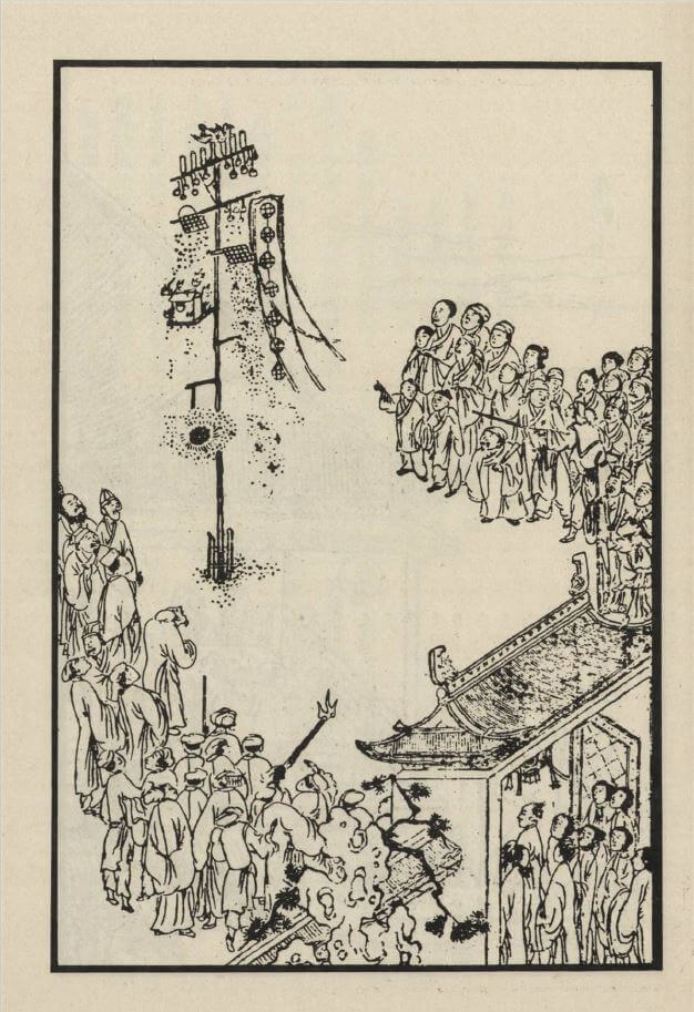 「煙火架」又是怎樣的形象?明代《金瓶梅》第四十二回〈豪客攔斗玩煙火 貴家高樓醉賞燈〉中,敘述西門慶大戶人家過元宵節時玩煙火,「分付四架煙火,拿一架那裡去;晚夕堂客根前放兩架。」從明崇禎刊本的插圖版畫可見,各式煙火、花燈、蠟燭被高高掛在竹架或木架上點燃,圍觀眾者眾,人群中還有一人手持長竿點火,場面熱鬧歡慶。