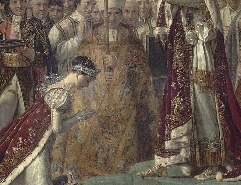 拿破崙與第一任妻子約瑟芬.德.博阿爾內(Joséphine de Beauharnais)於1804年12月2日在聖母院舉行加冕儀式,圖為新古典主義藝術家大衛繪製的《拿破崙一世皇帝的加冕禮》(局部),描繪出約瑟芬跪著接受后冠加冕。