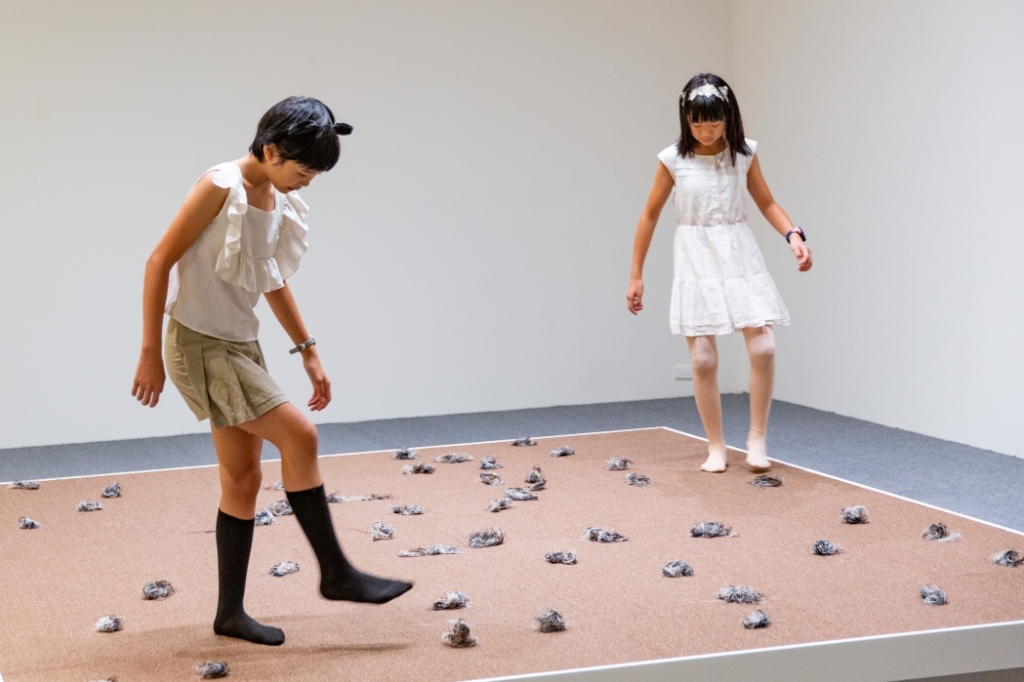 呈現曼妙舞姿的《夜舞》是以柔軟的陶土為媒材,在藝術家徐永旭的手中,經過捏塑、拉伸等反覆動作逐漸成為力量與流動感兼具的造型。來到陳松志《無題-房間三》,藝術家邀請觀眾以足部踢動、形塑地面上散落的棉線,這些棉線會隨著展覽期間的累積,不斷被改變樣態,將一路有機發展直至展期結束。