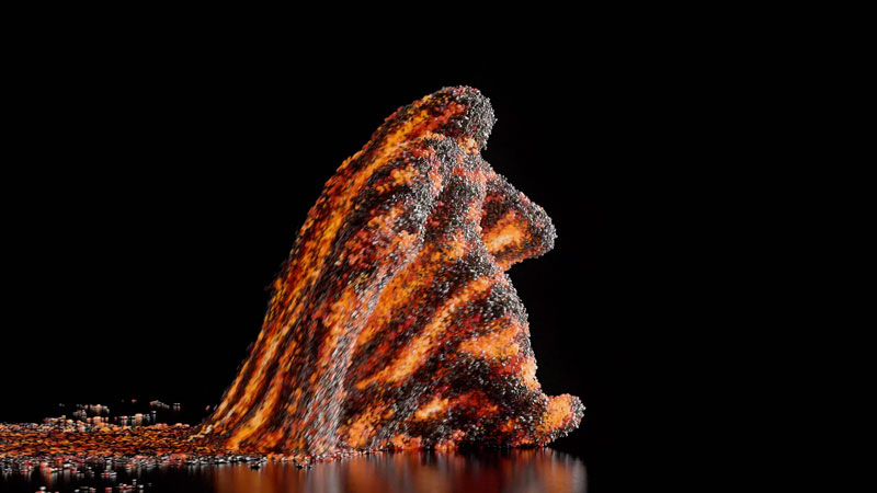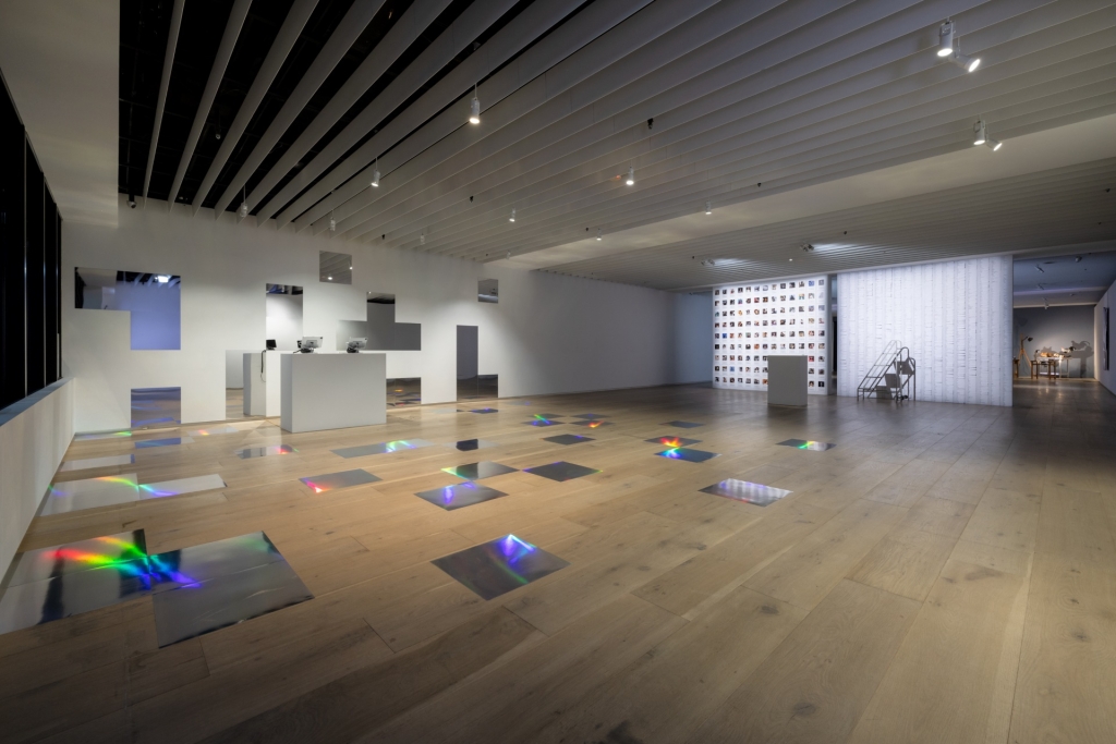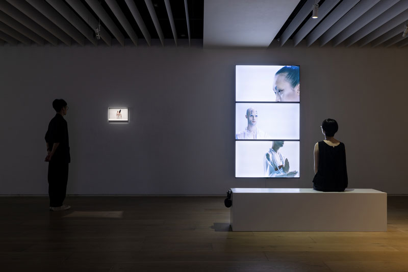而在忠泰企業大廳展區中,以九台電視組成巨大螢幕牆展出英國藝術家團隊Universal Everything的作品《變形》,大型螢幕與聲音設計,為觀者帶來沉浸式的觀影體驗。其六分鐘的錄像中描繪一位不停行走及變型的人形,人的行走,結合著火、石頭、水等元素的演化。這個人形近似乎人,又似乎超越了人,而喻示著未來的、超越的生命狀態。