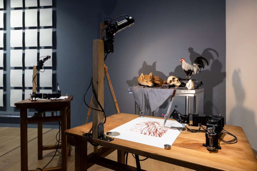 帕特里克.特雷塞特(Patrick Tresset)的《人類研究#2 公雞與狐貍等的大虛幻》是一件大型裝置作品,初見該場景如同是靜物畫的畫室,不同的是此次是由機器手臂透過鏡頭觀看靜物,再進行演算、程式碼來控制機械手臂畫下所見之物。由人類創造出的圖像,在文明中扮演重要的角色,它能再現事物,更能觸動人心,而今在特雷塞特的作品中,繪畫已不再是人類獨有的能力,人與機器的合作,讓古典寫實繪畫中「再現」的觀念在作品中受到顛覆,人機間的主體性、作者性之探討亦引人深思。
