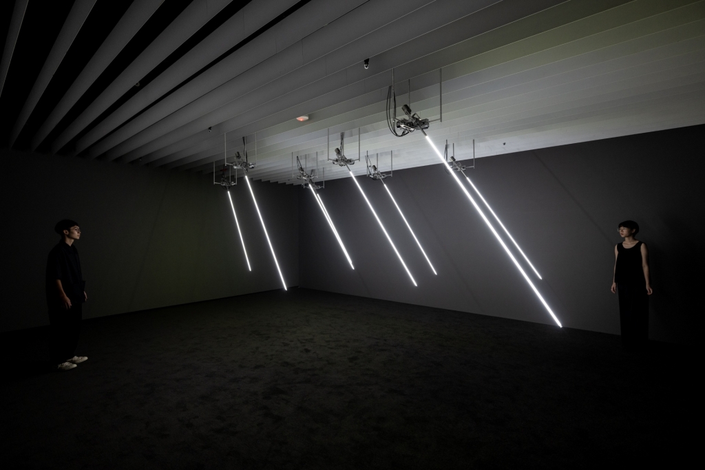 除了對於機器、技術的探問,陳乂的作品《風場》為展覽帶來沉浸的氛圍及詩意的視覺表現。《風場》在獨立展間展出,藝術家透過動力裝置及AI技術學習,趨動光條並模擬風運動的狀態。風原是不可見的存在,但在藝術家的操作之下,觀者從光條的運動幅度與頻率中,感受到若有似無的風動。大自然因為科技模仿,以不同的形式被再現,藝術家也藉此尋求科技應用與環境永續之平衡的可能性。