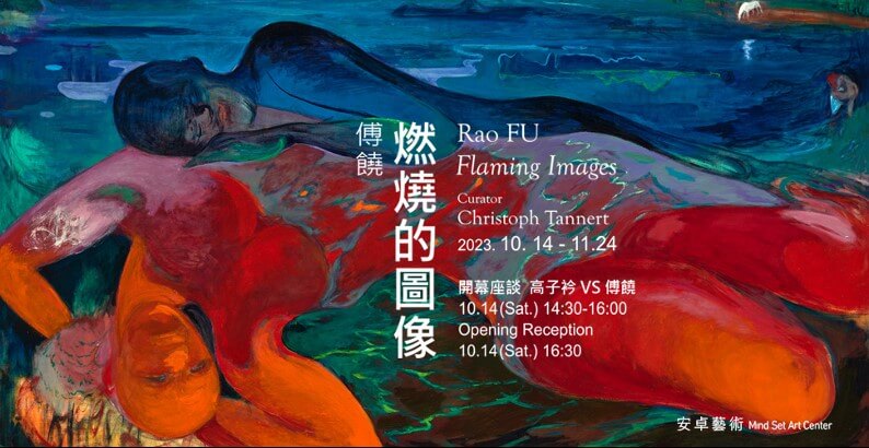 傅饒個展「燃燒的圖像」由德國藝評家克裡斯多夫.唐涅特(Christoph Tannert)策畫,呈現傅饒油畫、水彩和雕塑的20多幅最新創作。傅饒大膽地運用鮮明瑰麗的色彩,史詩般氣魄的場景,繪出壯麗景觀之下的鬼魅飄忽人物。從而創造出一幅幅兼具豐沛情感和戲劇張力的人文景觀,並且展示獨特而開闊的創作維度。