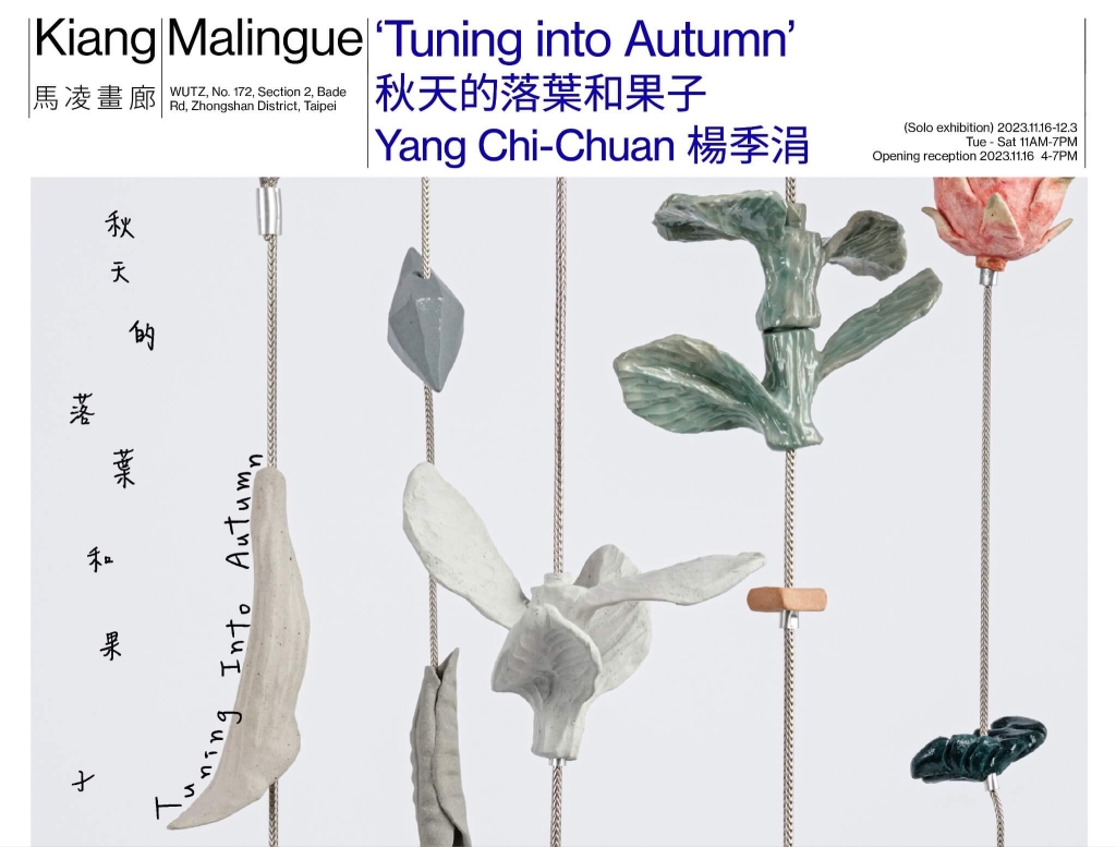楊季涓個展「秋天的落葉和果⼦」展出藝術家於2023年創作的裝置及雕塑作品。此次展覽通過手工製作的微型陶瓷物件及寧靜的聲音元素呈現與楊季涓臺北雙年展作品截然不同的情緒:相較於雙年展作品對內⼼恐懼和不安的窺探,「秋天的落葉和果子」提示著平和面對生命經驗的方式。