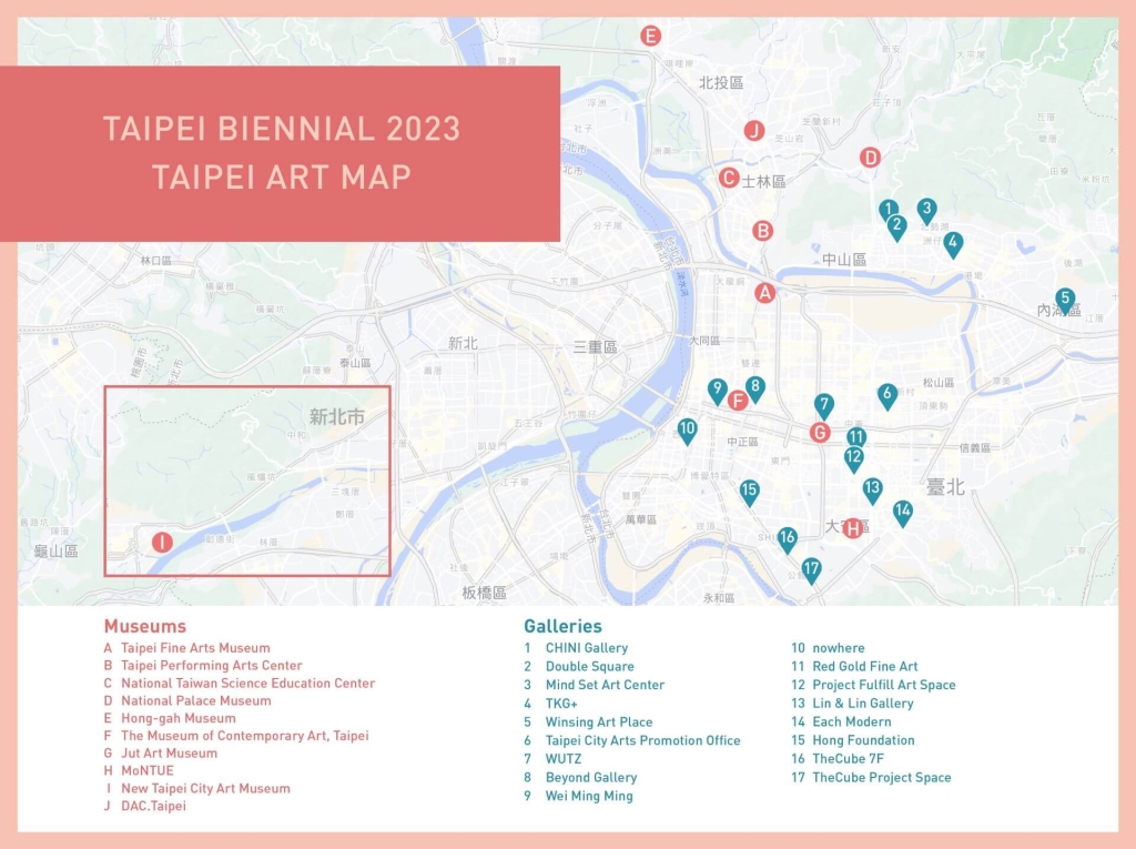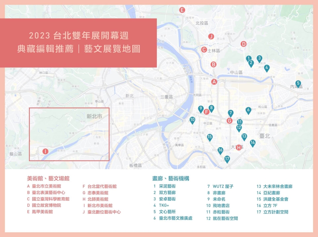 因此,典藏團隊亦在雙年展開幕前夕,選集規劃了26檔於大臺北地區現正舉辦的展演地圖,讓藝術愛好者們能一覽台北雙年展開幕週的藝術能量。