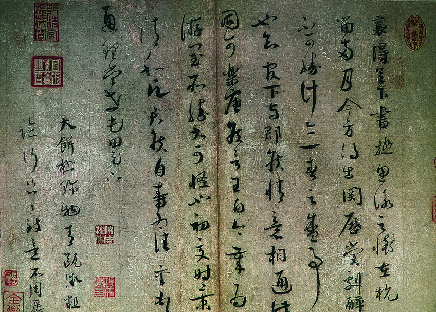 如同文獻所載,這類帶有織品紋路的紙張大多伴隨著砑花圖案,在宋人信札中仍保存數例,有時也運用於書畫作品中,最有名應該就是黃庭堅〈自書松風閣詩〉(圖3)。前三張紙跟蘇易簡所介紹的完全一樣,不僅有精美的砑花紋,整張紙的底紋也是呈現格子狀的織品紋路,可稱為羅紋(魚子)砑花箋,是製作等級相當高的宋代紙張。由於織品紋路布滿整紙,連砑花圖案上都有,因此製作工序可以確定是先壓完花紋後,再將全幅隱出羅紋。經過比對,第二、四紙的瓜瓞圖案乃出自同一雕板,兩張紙質也相當接近,然而第四紙卻沒有橫直交錯的紋路,可以證明織品紋路並非出自抄紙簾,而是事後才加工上的。