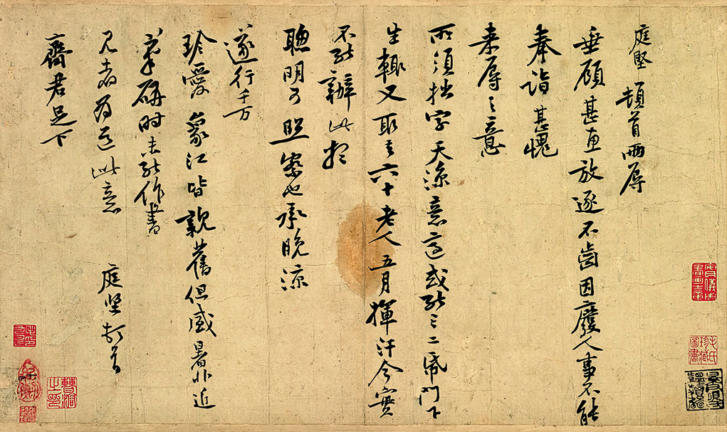 宜州書信中有一封相當珍貴的信札墨蹟仍傳世,內容:「庭堅頓首。兩辱垂顧,甚惠。放逐不齒,因廢人事,不能奉詣,甚愧來辱之意。所需拙字,天涼意適,或能三二紙,門下生輒又取去。六十老人,五月揮汗,今實不能辦此,想聰明可照察也。承晚涼遂行,千萬珍愛。象江皆親舊,但盛暑非近筆硯時,未能作書,見者為道此意。庭堅頓首齊君足下。」(參考圖13)信中提到自己是六十老人,所以時間當為崇寧三、四年中的五月。若當時已有門下生取去所寫書法,應該就不會是剛到宜州的崇寧三年五月,畢竟當時連基本生活都很困難,遑論寫字、教學生。因此,時間應該是指崇寧四年的五月,此時黃庭堅已經安頓下來,而且開始有學生跟隨。
