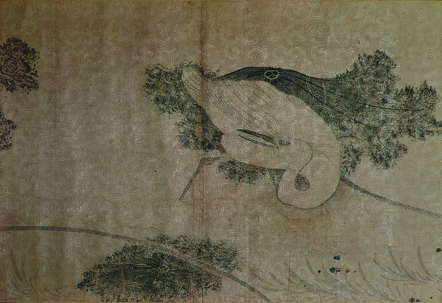 除了李建中〈同年帖〉,沈遼(1032~1085)〈動止帖〉的水紋上清楚塗布白色物質,具有相當的拒墨性,與浮水印的暗花紋不同。(註3)同樣帶有美麗水紋的還有傳蘇軾〈昆陽城賦〉(圖1,私人藏),此卷由兩張砑花箋紙組成,第二張稍短,紙面除了布滿清晰水紋,還有隱藏著幾座不明顯的樓閣。第一紙從正面幾乎見不到紋飾,只能從書法線條的吸墨程度不一來判斷紙張本身印有花紋。經過影像處理後,發現第一紙的構圖十分複雜,右上方有一隻長尾張翅禽鳥,左下也有一隻背對觀者的禽鳥,其間裝飾著花草,為一完整的構圖。此二紙無論從構圖或是雕工來看,都屬於宋代製作最為精美的砑花箋紙,目前尚未見到類似的構圖,所以在製紙工藝史上是極為罕見且珍貴的實例。