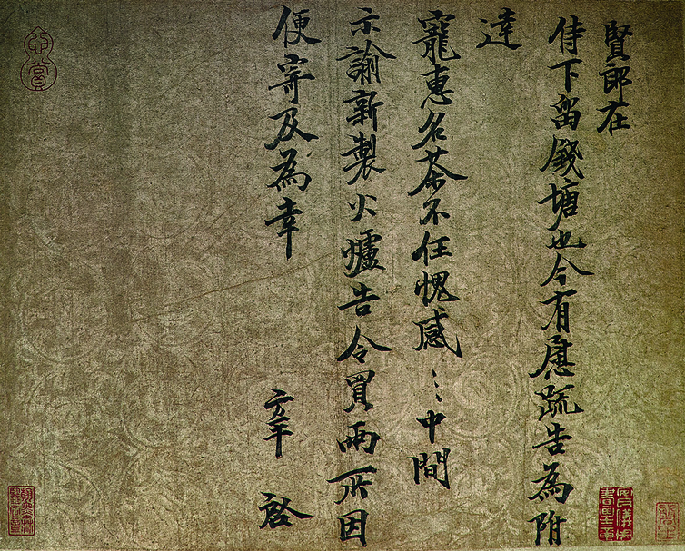 蔡襄〈致通理當世屯田尺牘〉(圖12),書於皇祐三年(1051)四月離開杭州時,與馮京(1021~1094)的道別信,並贈大龍團茶及青瓷茶甌,這兩物在當時都極為名貴,大龍團茶此時應該仍是貢品,小龍團茶則是蔡襄在慶曆七年(1047)任福州轉運使時開始監造進貢。全作行筆沉穩,結字端麗,揮灑自如,瀟灑飄逸,是其行草書中的佳作。書家使用一張飾有蝴蝶紋樣的羅紋砑花箋,蝴蝶紋樣為對飛圓形構圖,外飾一圈珍珠紋,類似蝴蝶紋飾也出現在瓷器與服飾上,或許亦有特殊意義。