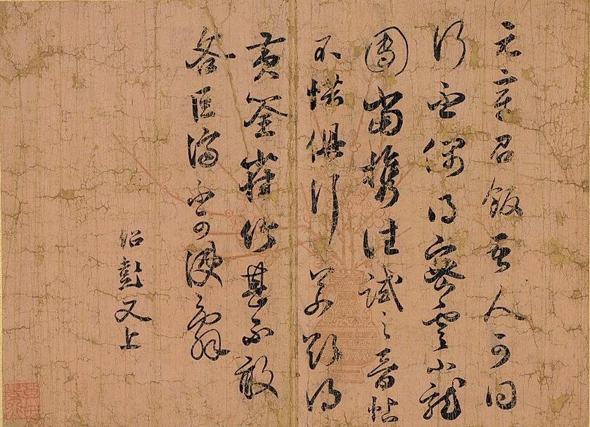 花紋不明顯的箋紙中也有不少是屬於羅紋砑花箋。蘇軾〈致運句太博尺牘〉(參考圖2),用筆勁秀,線條流美,據書風推測約書於熙寧四年(1071)。紙張為折枝梅羅紋砑花粉箋,雖然部分脫落,仍可以清楚見到梅花姿態。透過信箋的等級也可以稍稍反映出書家的態度,信中感謝對方致贈極佳妙的「臨安香合」,乃盛放香料的容器,有金、銀、瓷、漆等材質,也經常用作壽禮。