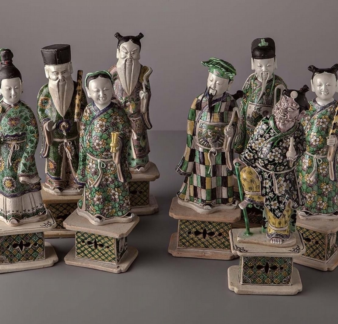 以經營外銷瓷聞名的Jorge Welsh Works of Art,這回帶來一套〈晚宴瓷器餐具組〉(圖3)氣勢非凡。這組製作於清代乾隆朝的琺瑯彩瓷器,中央不但繪有繁花盛開的牡丹、雛菊與漿果,四周邊緣亦綿延散布著菊花、蓮花與罌粟等裝飾,整體展現富麗堂皇的鮮豔美感。最後在Vanderven Oriental Art推出的「人物像(Figures)」專題中,展品從雕刻到繪畫、涵蓋廣泛。例如一組清代〈八仙群像〉(圖4),它們是在素胚上施以綠、黃、茄紫色,這種三色琺瑯被稱為「素三彩」,曾流行於康熙時期。每位主角的穿著、姿勢和法器均有不同,突顯古代匠師對人物體相的細膩觀察與捕捉神韻的技巧。