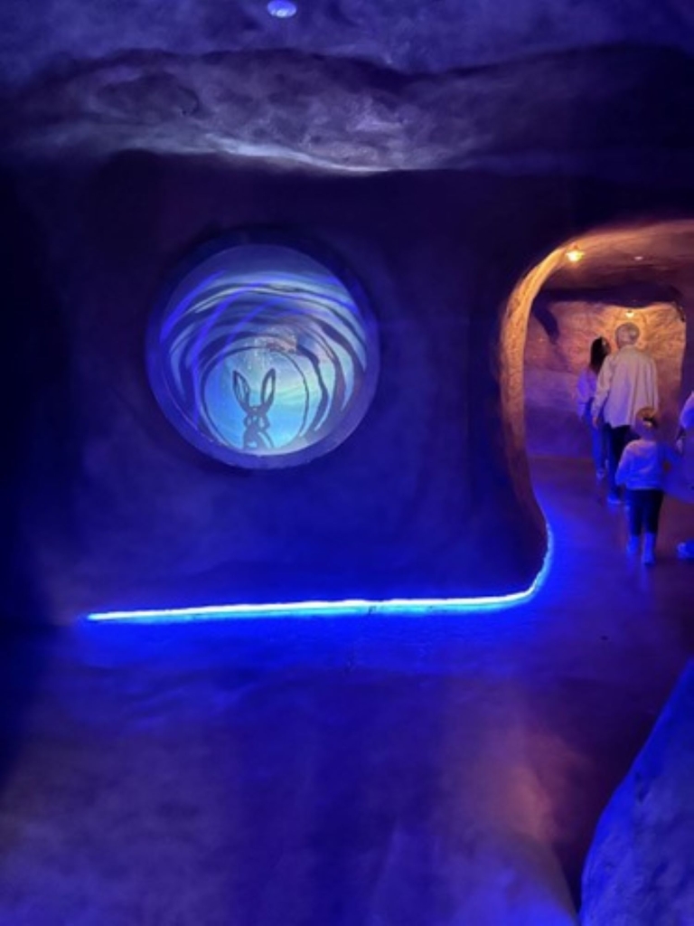 博物館的外觀看得出還是工業區廠房的模樣,屋頂上三隻會發光的兔子,以及人行道上的兔子腳印,幫助參觀者知道博物館到了!順著腳印走進博物館,印入眼簾的是一個通往地底的大洞穴,以及牆面上的兔子主題裝飾。如同《愛麗絲夢遊仙境》的故事情節般,參觀者穿過地下的兔子洞,鑽進了神奇的故事世界。