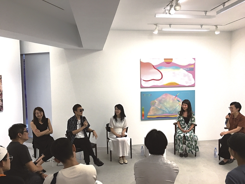 亦安畫廊舉行台、日攝影新銳展,由二手舍羅苓寧主持與藝術家吳美琪、葉樺、大野真人的創作座談(由右至左)。左為亦安畫廊負責人黃亞紀。(攝影/林亞偉)