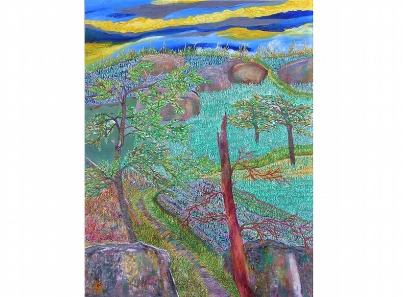 由於工作需要,經常穿梭於歐洲各國鄉野之間,遂將他記憶底下寬闊寧靜的田園在畫布上撩動出特有的詩意風格。同時,早期在融入生活的歲月中經常在愁緒、空虛、困頓中不斷地與堅忍、撫慰與淬鍊相互交替行進,雙腳經常承載著在飄盪人海裏備感壓力的體重,這樣的人生體驗也抒發出藉景懷想記憶中的種種遭遇。正如「山丘」一畫中所呈現出的田野、巨石、樹林與枯木一般。他經常藉著四季冷暖色調的變化,轉化成記憶中人生體驗的重現。