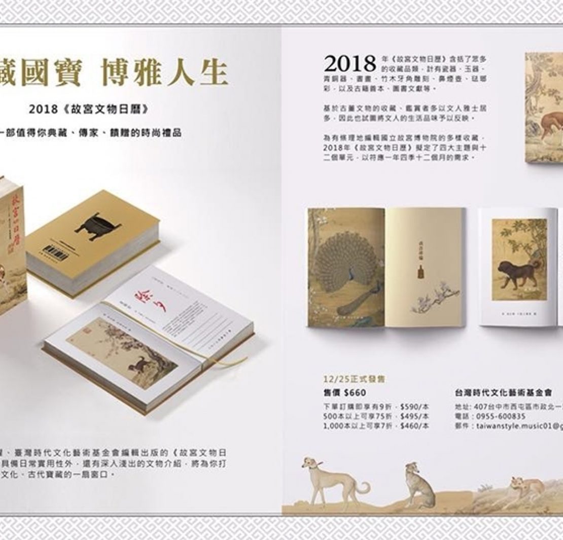 收到「2018年故宮文物日曆」了嗎?包含「故宮書畫三寶」、郎世寧「十駿犬圖」的文物年曆,精選故宮國寶,珍貴實用,被視為最具精神性的狗年賀節禮。日前印製完成,陸續上架,許多人收到年曆書後,驚喜不已,不但印工精細,背後365個圖版典故多元,饒富趣味,為狗年的到來,拉出好彩頭,更為故宮院長林正儀落實故宮美學生活化,作出具體回應。