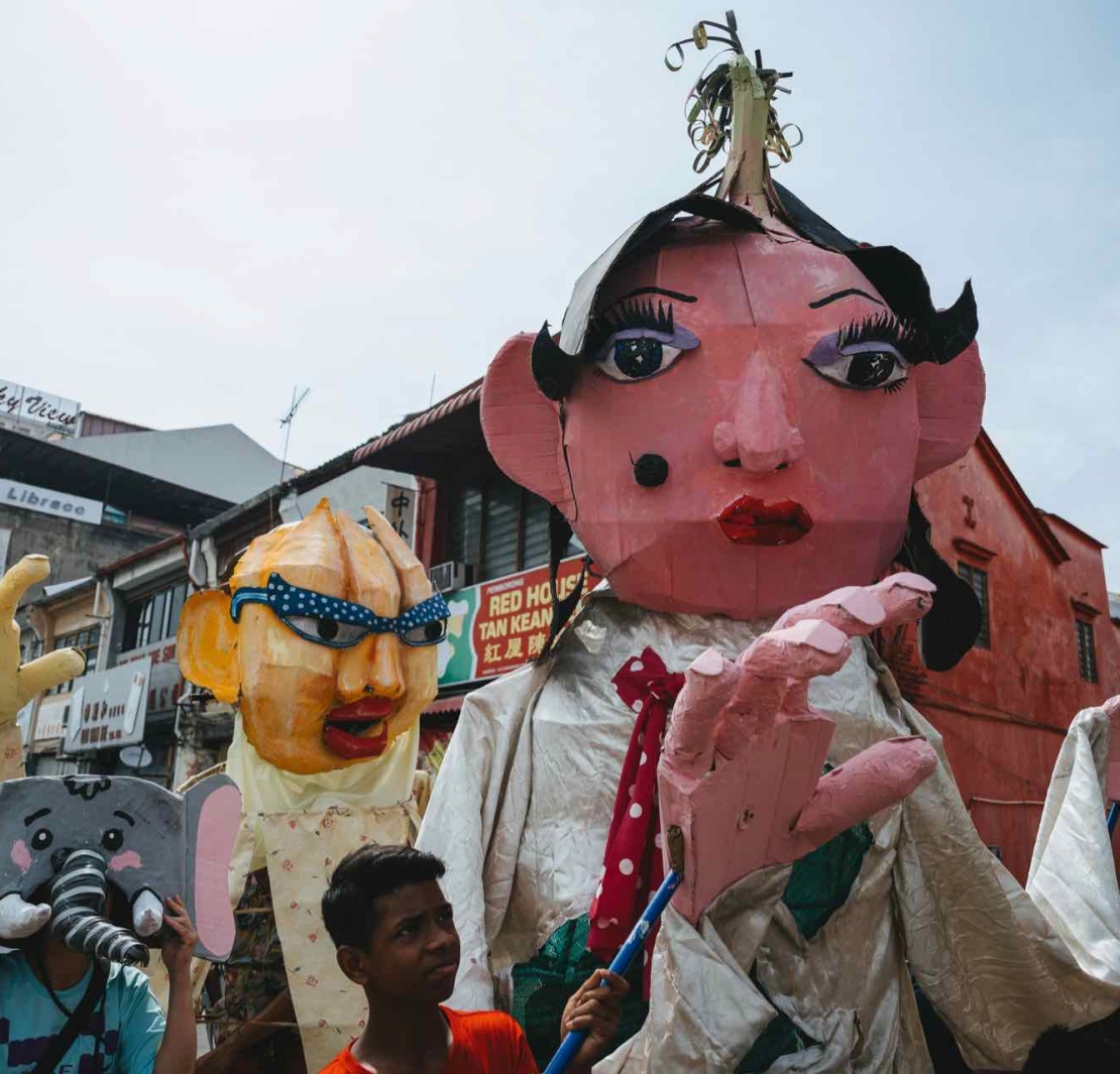 今年喬治市藝術節之中量體最大型、時間跨度最長的藝術計畫,當屬全民參與的巨偶踩街遊行。本文最後將以此為例,來跟一開始提及的布袋戲作出尺度上的對照,討論群眾欲力如何有可能從近身與眼力中顯身。