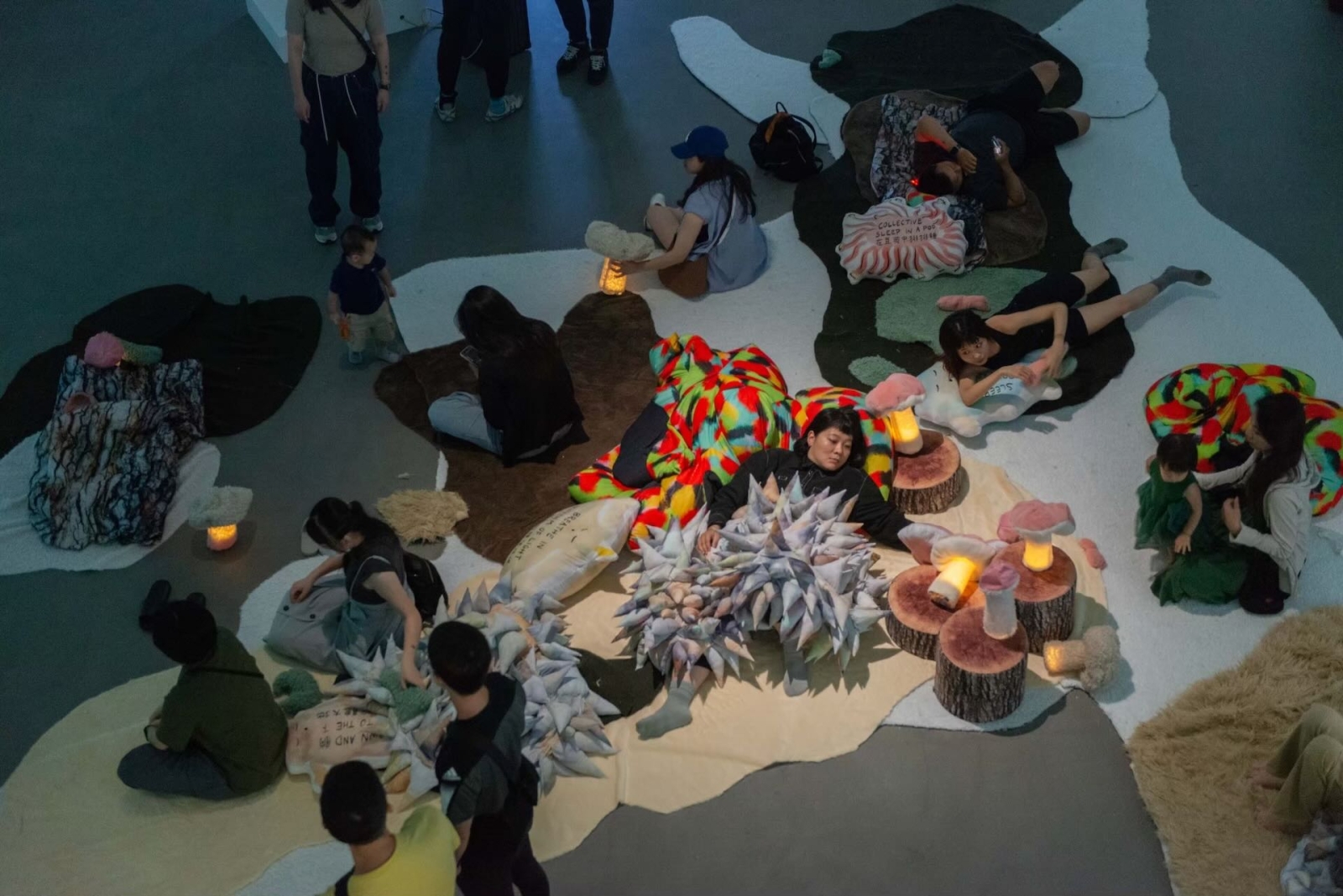 這兩件作品一方面展示AI演算法如何傳遞關於生態變化的信息,另一方面點出身體經驗在展場中的重要性——除了視覺之外,我們還必須動員全身的感官,才能真正的閱讀展覽。對呂岱如來說,改變身體慣常的感知跟動能,使身體成為不同的中介,才能發現討論政治、環境議題的嶄新方式。於是,黃鼎云、陳業亮《半睡半醒,生死微微》打破一般美術館以「觀看」為主的閱讀方法,讓觀眾的身體如動物冬眠般躺進柔軟的拼接布料中,身體也在觀看與被觀看中進行政治的翻轉,而在公共空間中的休息與睡覺亦模糊了私密與公共的界線。