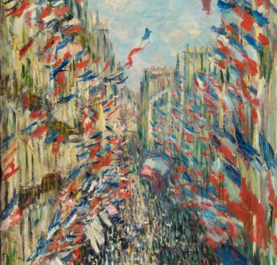 不少人若提到印象派繪畫中的巴士底日,腦海中可能會馬上浮現莫內繪於1878,一幅大街上兩側掛滿紅白藍三色旗的作品。事實上,莫內於當年畫了《巴黎蒙托爾熱街,1878年6月30日慶典》(La Rue Montorgueil, à Paris. Fête du 30 juin 1878)及《聖丹尼街,1878年6月30日慶典》(Rue Saint-Denis, Fête du 30 juin 1878)等兩幅作品。透過作品名稱即可發現莫內所描繪的場景並非國慶日當天,而是當時為了配合萬國博覽會而發起的慶祝活動。然而我們依舊可以透過莫內的作品,發現藝術家不僅不排斥將旗海飄揚入畫,同時亦透過印象派的手法為法國國旗增添不同的詮釋角度。